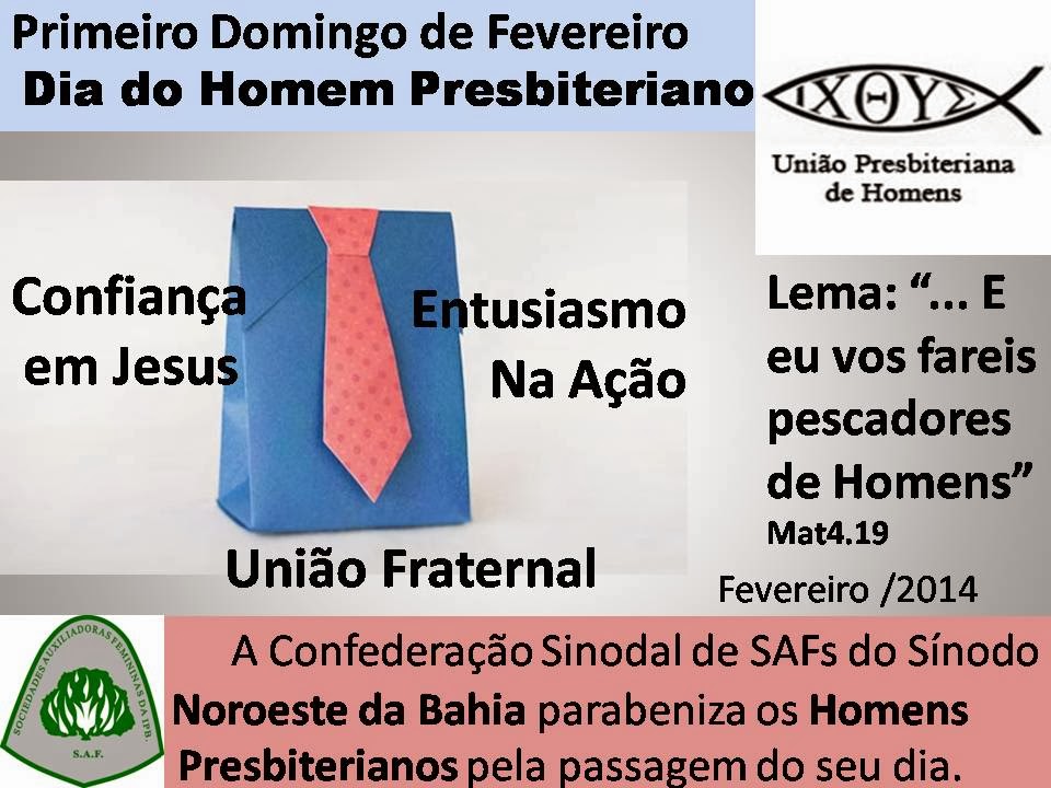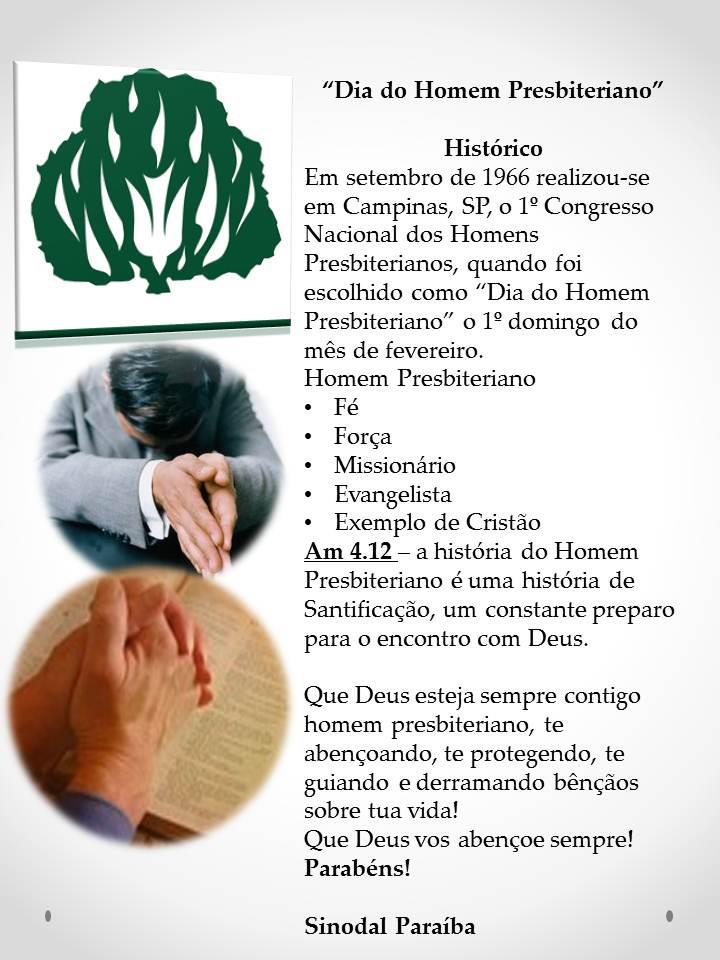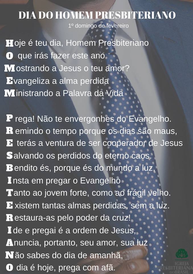 Dia Do Homem Presbiteriano 2022. WebComemoração é feita todo primeiro domingo de fevereiro…. O Dia do Homem Presbiteriano foi criado em setembro de 1966 quando na cidade de Campinas, SP, realizou-se o 1º Congresso Nacional dos Homens Presbiterianos, sendo escolhido o primeiro domingo do. Web1º Domingo: Dia do Homem Presbiteriano (06/02/2022) 2º Domingo: Dia da Mulher Presbiteriana (13/02/2022) 25/02 a 01/03: Final de Semana do Carnaval. ... Dia. WebDia do Homem Presbiteriano. Hoje, primeiro domingo de fevereiro, comemora-se o Dia do Homem Presbiteriano. Registramos aqui, nossa homenagem a todos os..