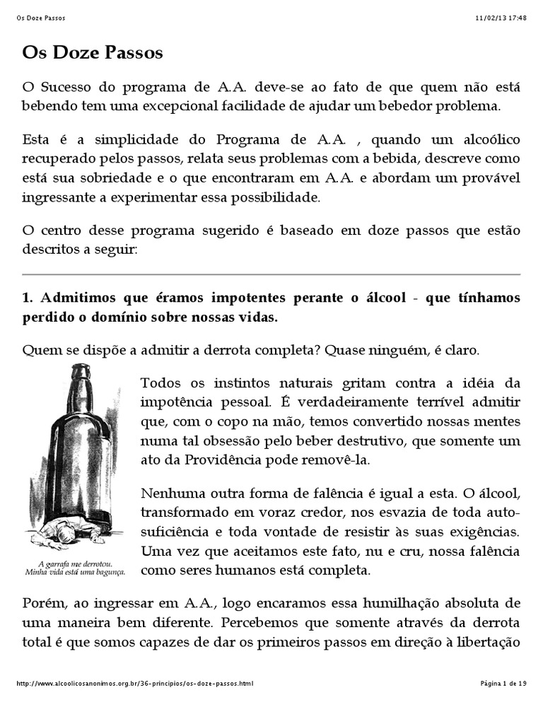 Os Doze Passos Do Aa. WebOs doze passos. O sucesso do programa de A.A. deve-se ao fato de que quem não está bebendo tem uma excepcional facilidade de ajudar um bebedor problema. Esta é a simplicidade do programa de A.A., quando um alcoólico recuperado pelos passos, relata. WebOs doze passos. As doze tradições. Os doze conceitos . Quem Somos? Junta de Serviços Gerais de Alcoólicos Anônimos do Brasil - JUNAAB ... aa@aa.org.br. Horário de. WebOs Doze Passos. Os Doze Passos de Alcoólicos Anônimos consistem em um conjunto de princípios, espirituais em sua natureza que se praticados como um modo de vida, podem..