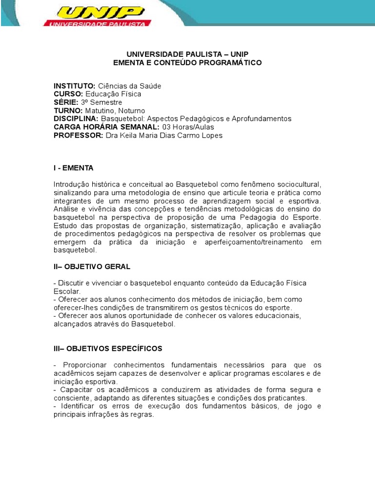 Plano de Ensino Basquetebol | Pedagogia | Cognição